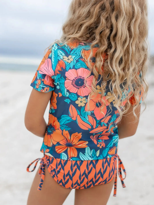 Navy and Orange Floral Short Sleeve Rash Guard Swimsuit