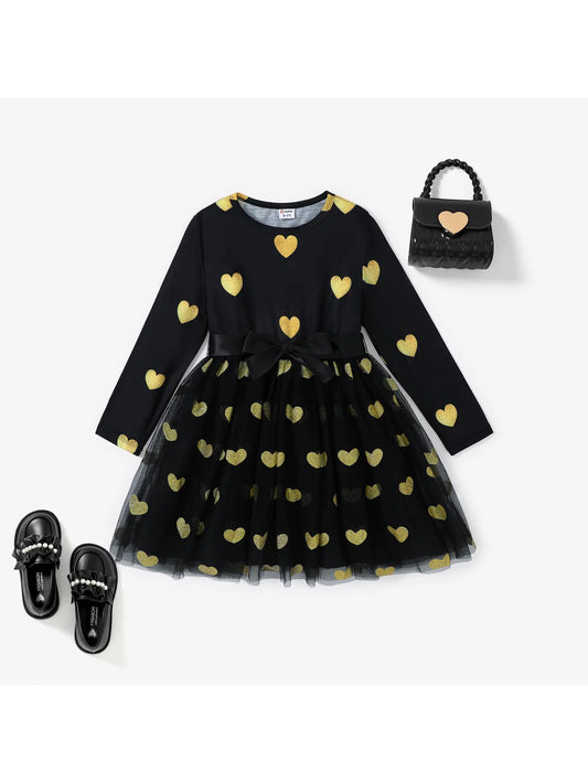 Black Long Sleeve Dress with Tulle Skirt and Gold Glitter hearts