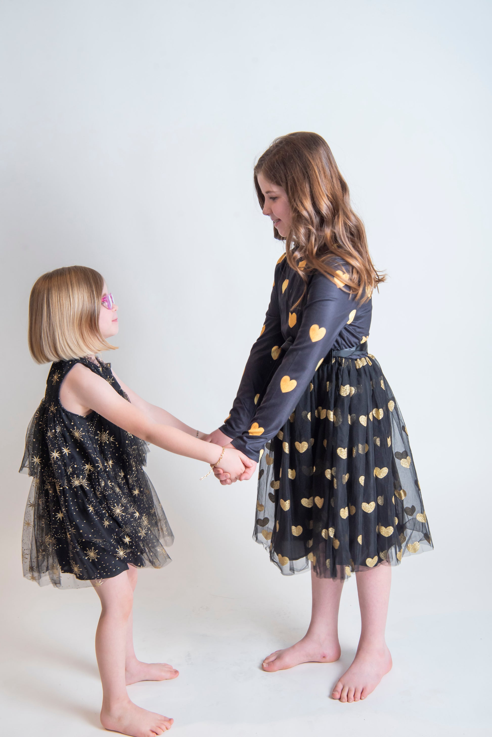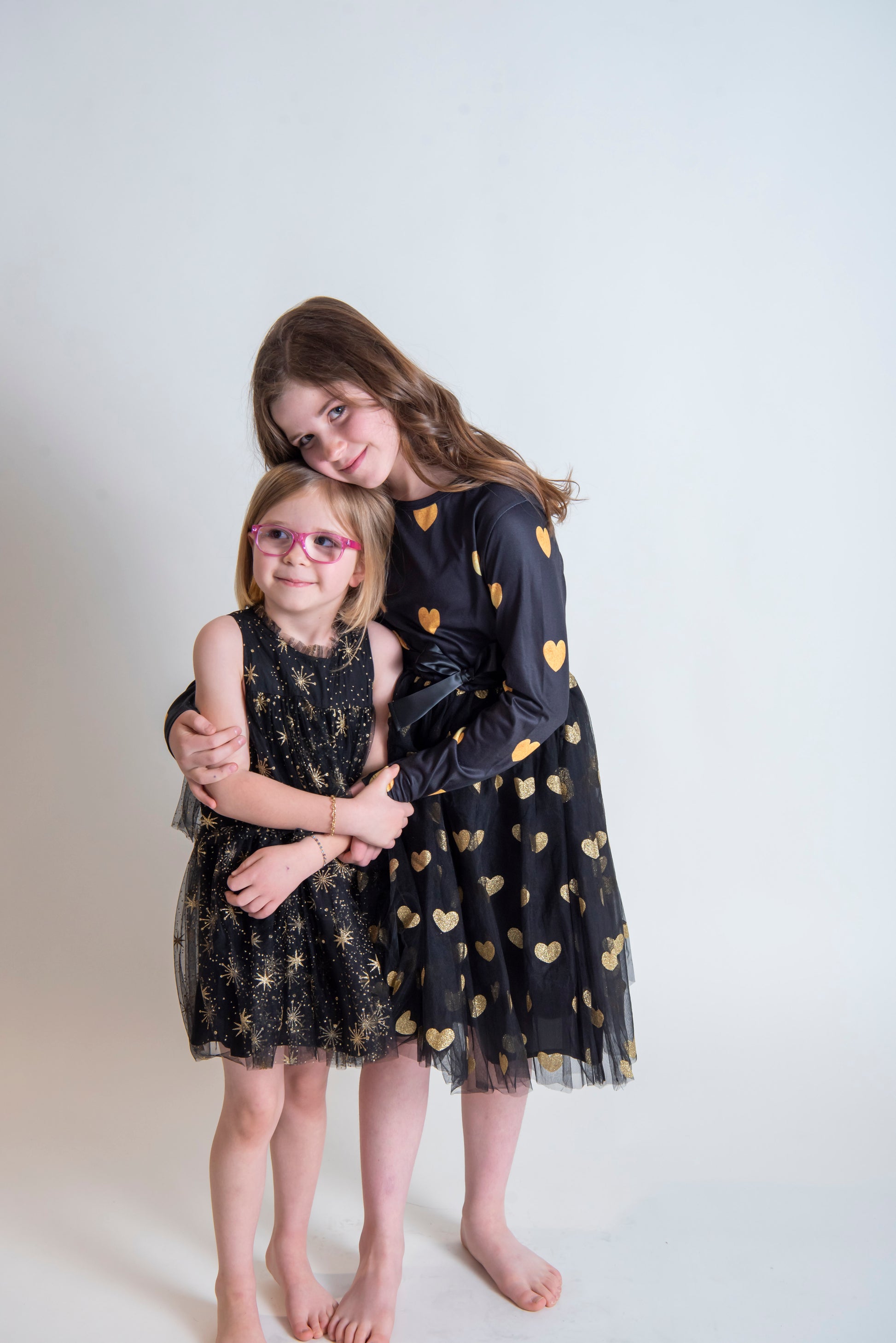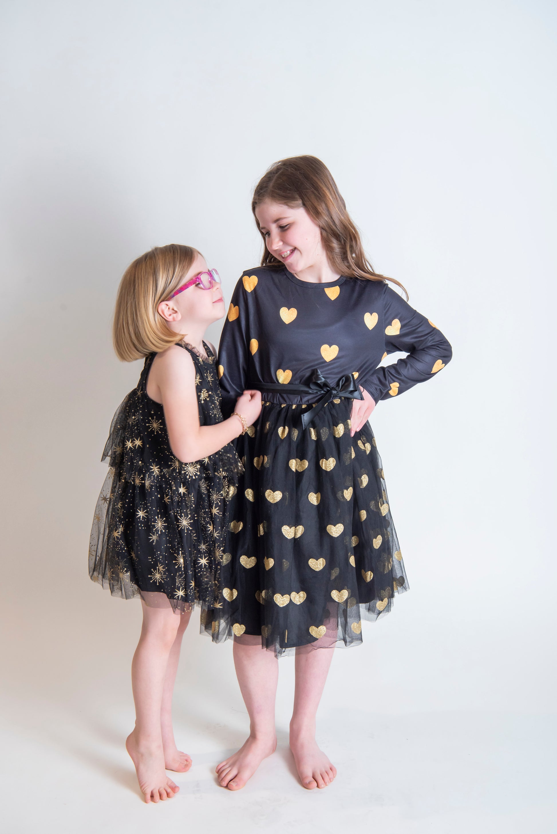Black Long Sleeve Dress with Tulle Skirt and Gold Glitter hearts