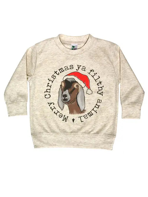 Stay cozy and festive this holiday season with our Christmas Goat Long Sleeve Tee! Featuring a cute Nubian goat graphic and the punny phrase "Merry Christmas ya filthy animal," this shirt is perfect for those who don't take themselves too seriously. Spread some holiday cheer while staying comfy.