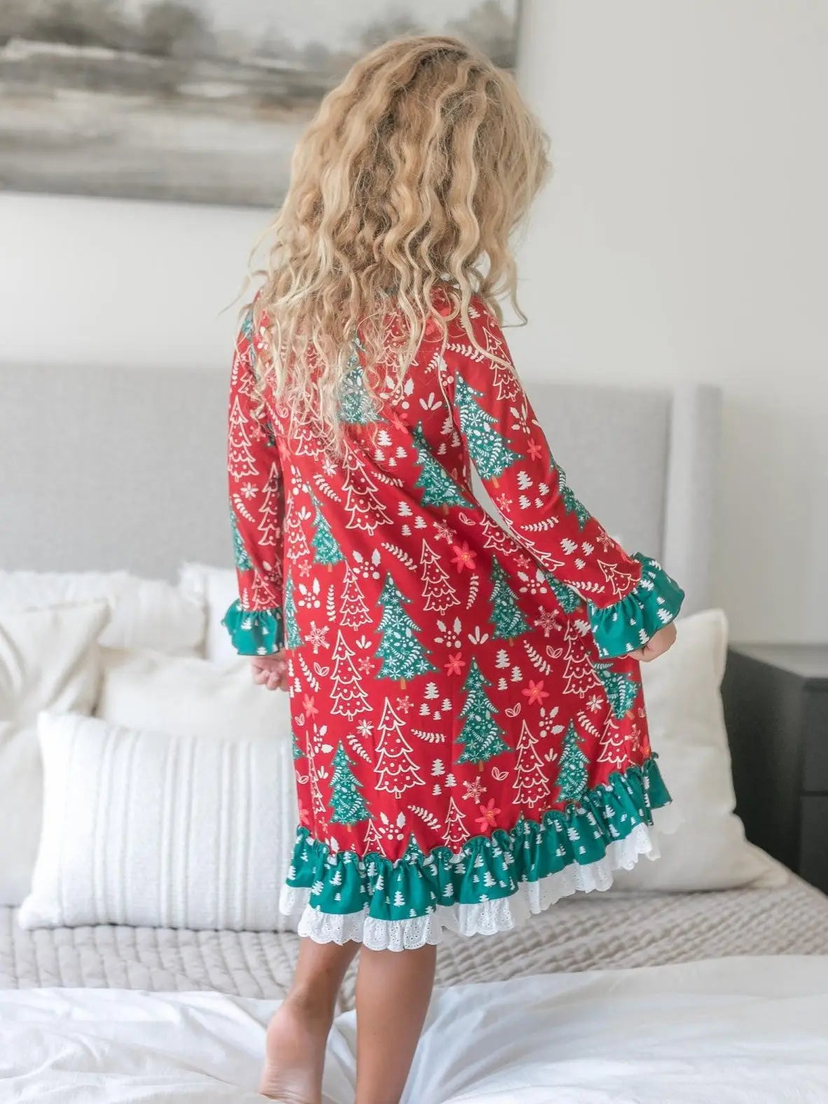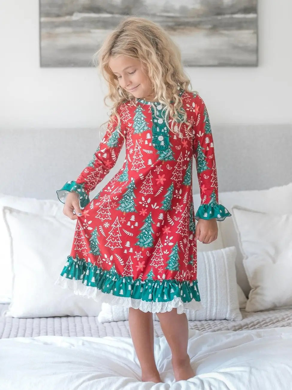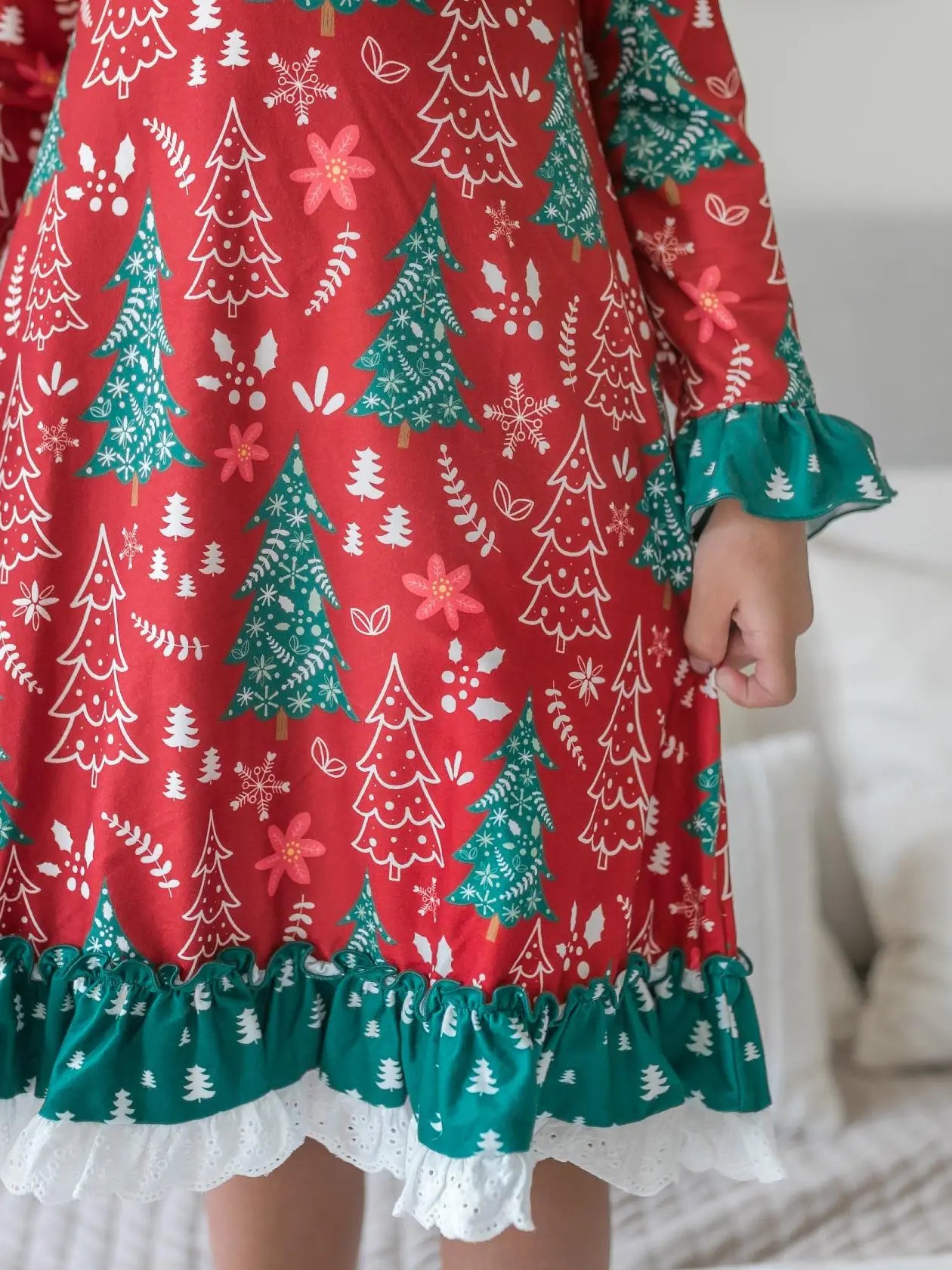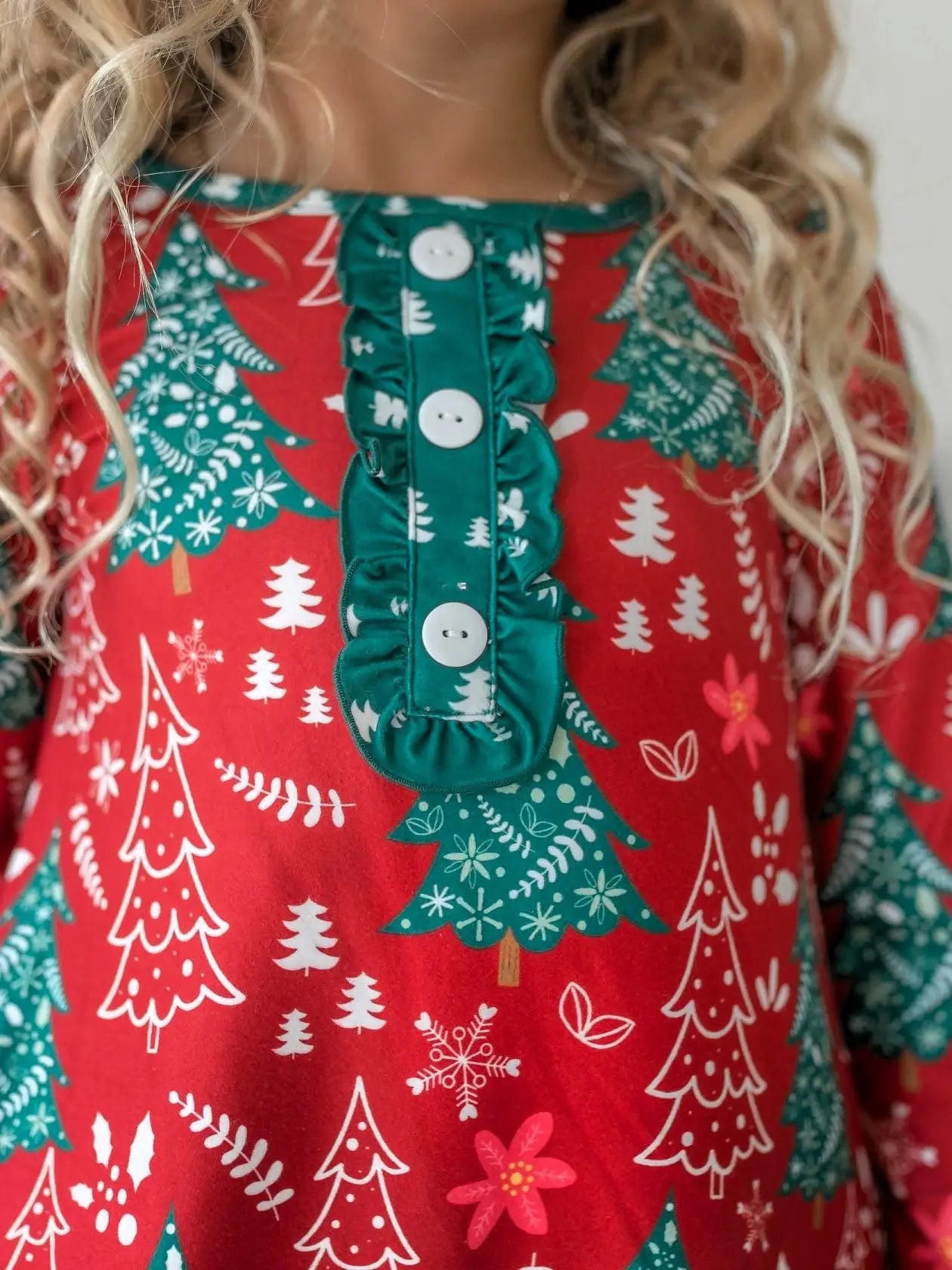 Make the holidays even more festive with our Christmas Tree Ruffle Gown. Made from soft cotton, this girl's gown features playful ruffle embellishments and comes in a classic red and green color. Perfect for twirling around the Christmas tree all season long!