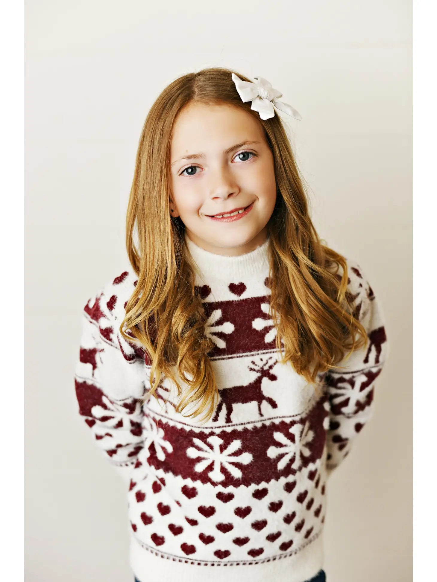 Get ready for the holiday season with this playful Fuzzy Reindeer Heart Crew Neck Sweater! Featuring snowflakes, reindeer, and hearts, it's the perfect combination for a festive look. Made for girls, this sweater will keep you warm and stylish all winter long.