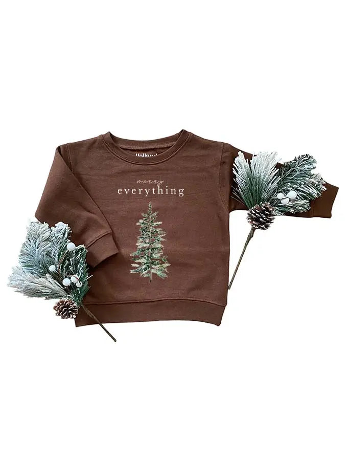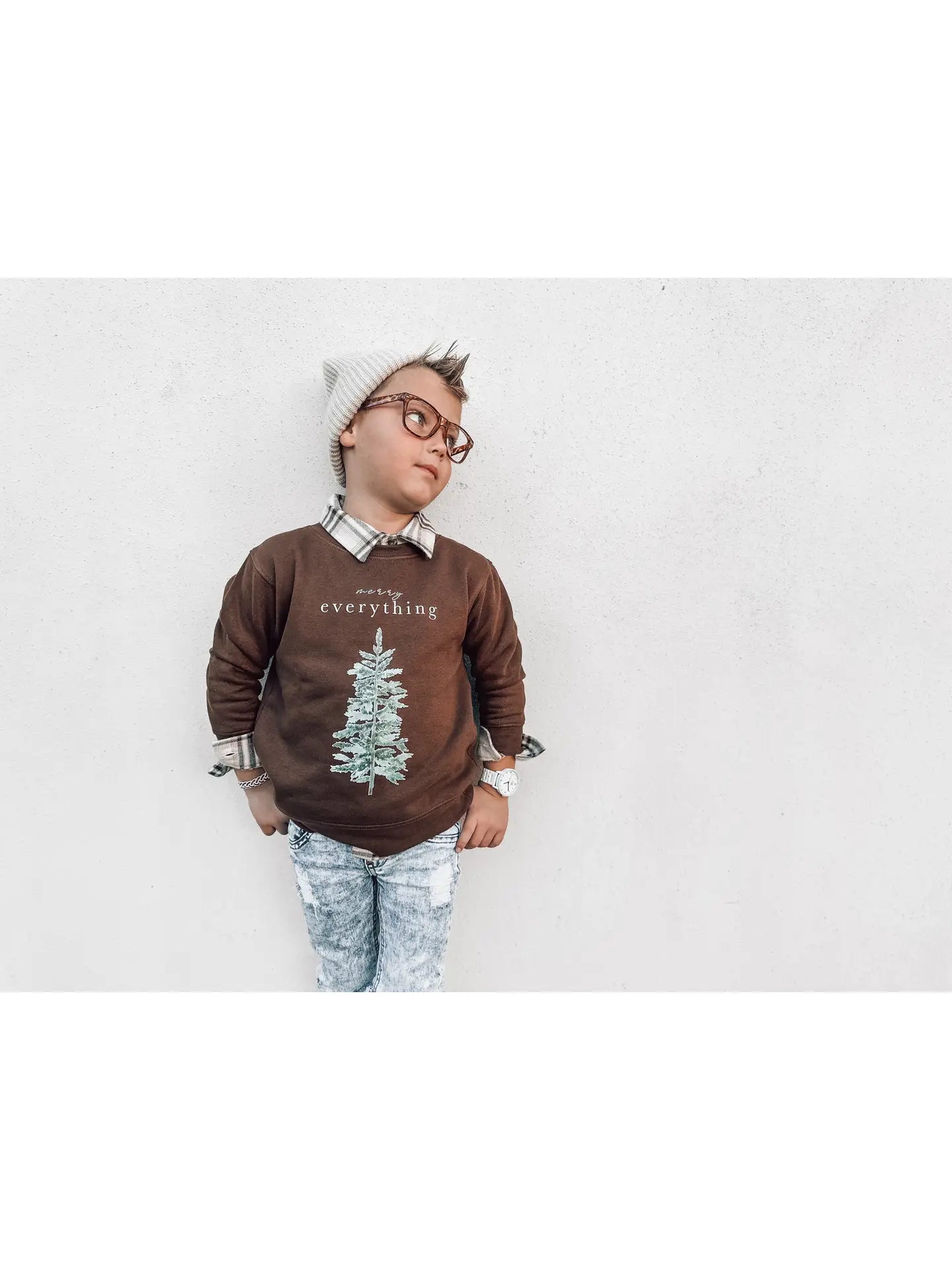 Stay cozy and festive all season long with our Merry Everything Sweatshirt! This brown sweatshirt features a playful Christmas tree graphic, making it the perfect addition to your holiday wardrobe. It's ultra-soft and warm, ensuring maximum comfort while spreading holiday cheer. Happy ho-ho-holidays!