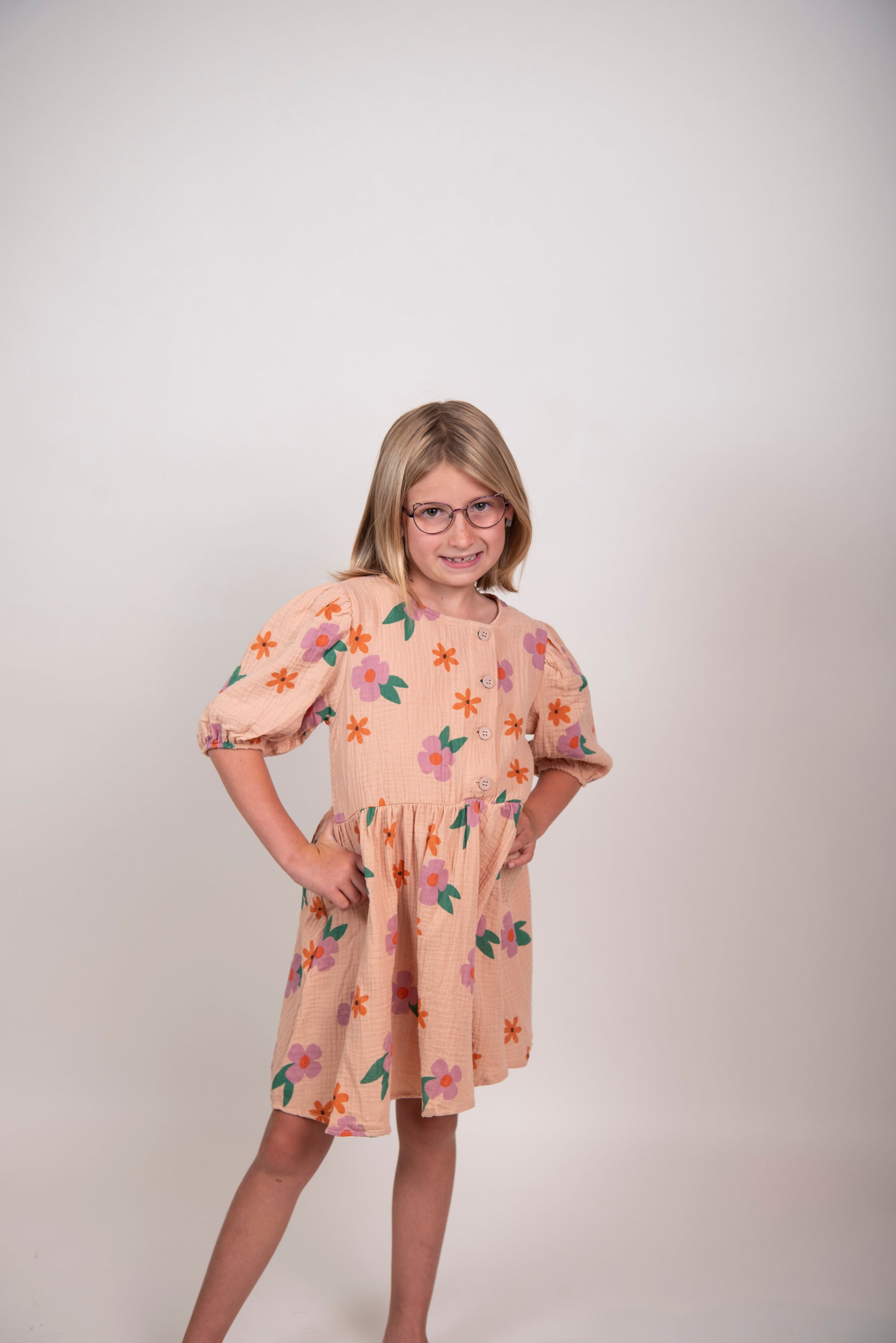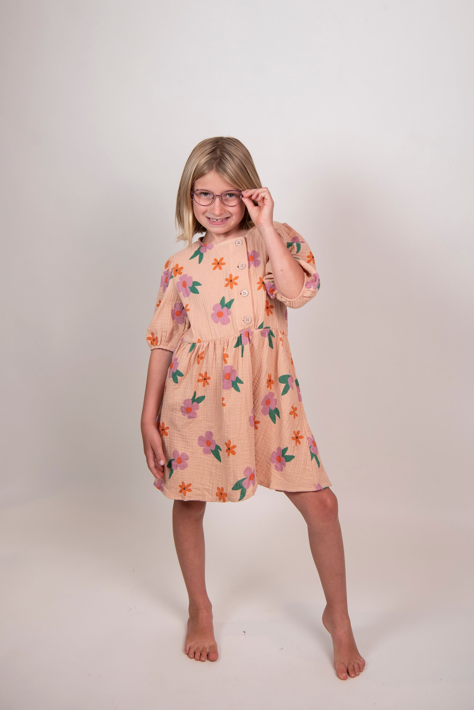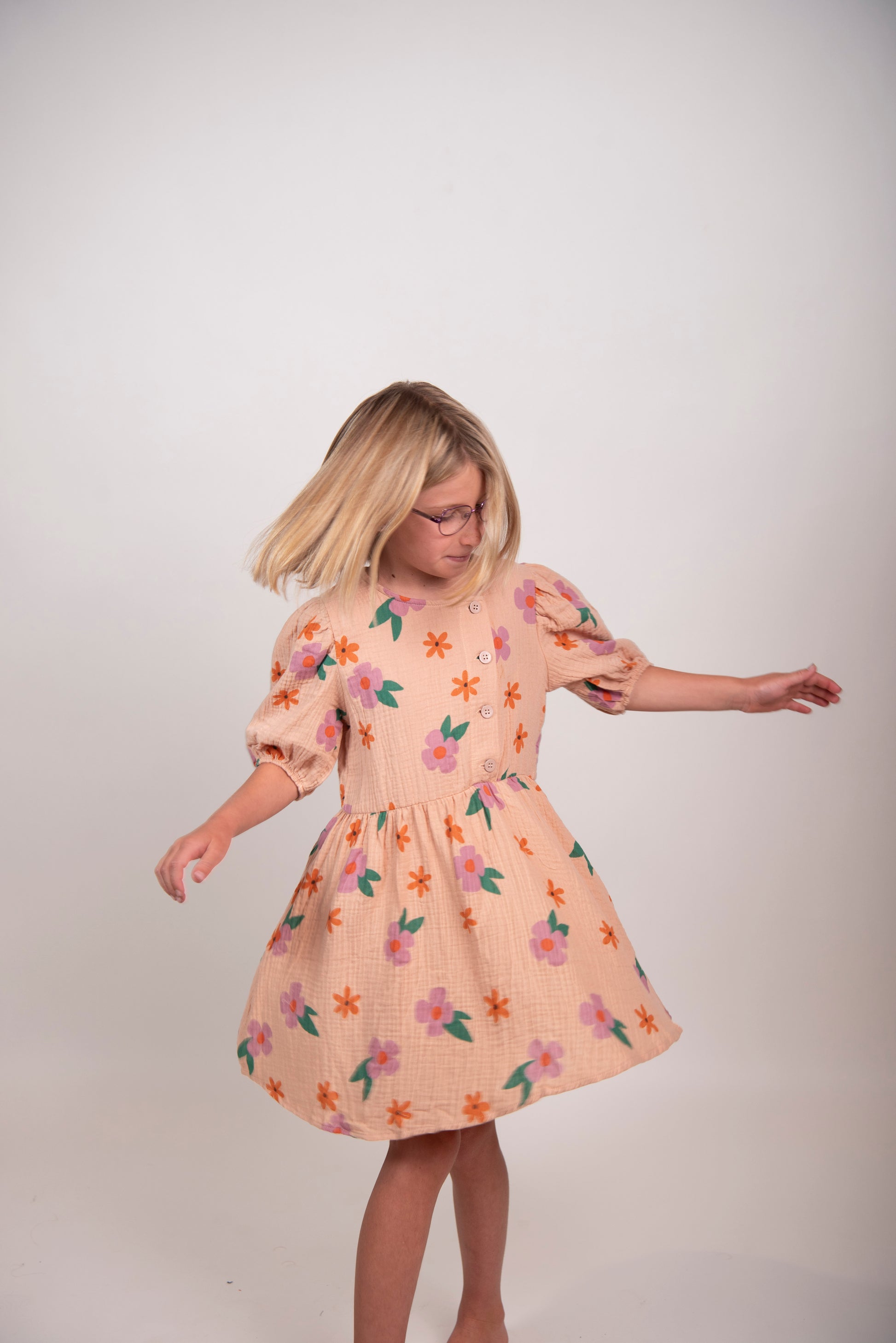This playful dress features 100% cotton muslin in a soft and stylish design. With off center buttons and a flowery pattern, you'll be the quirky life of the party in this dress!