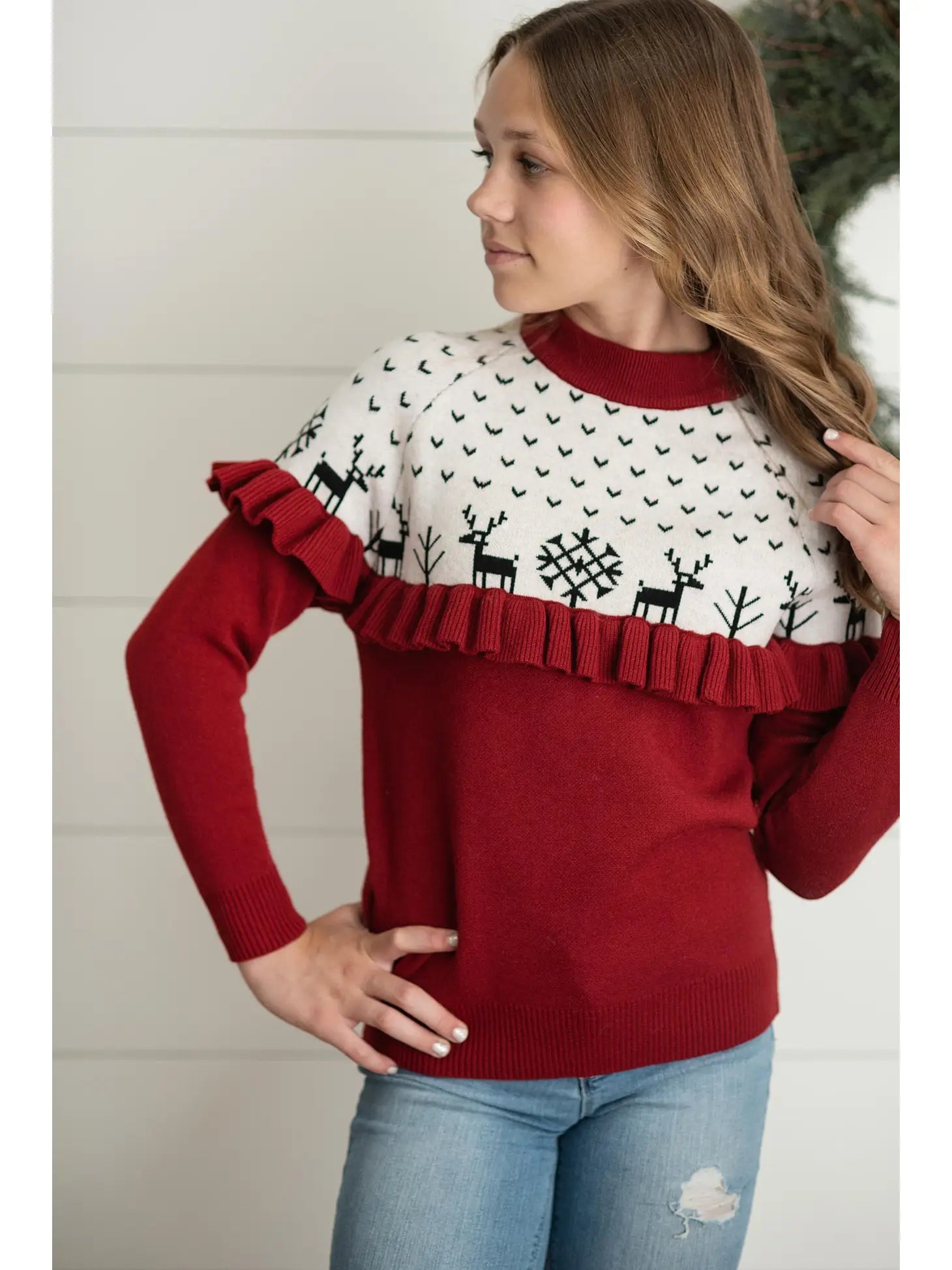 Get in the holiday spirit with our Reindeer Ruffle Pullover Sweater! Made with high-quality, soft material, this sweater is perfect for any festive occasion. It's a must-have for any girl looking to stay cozy and stylish this season.