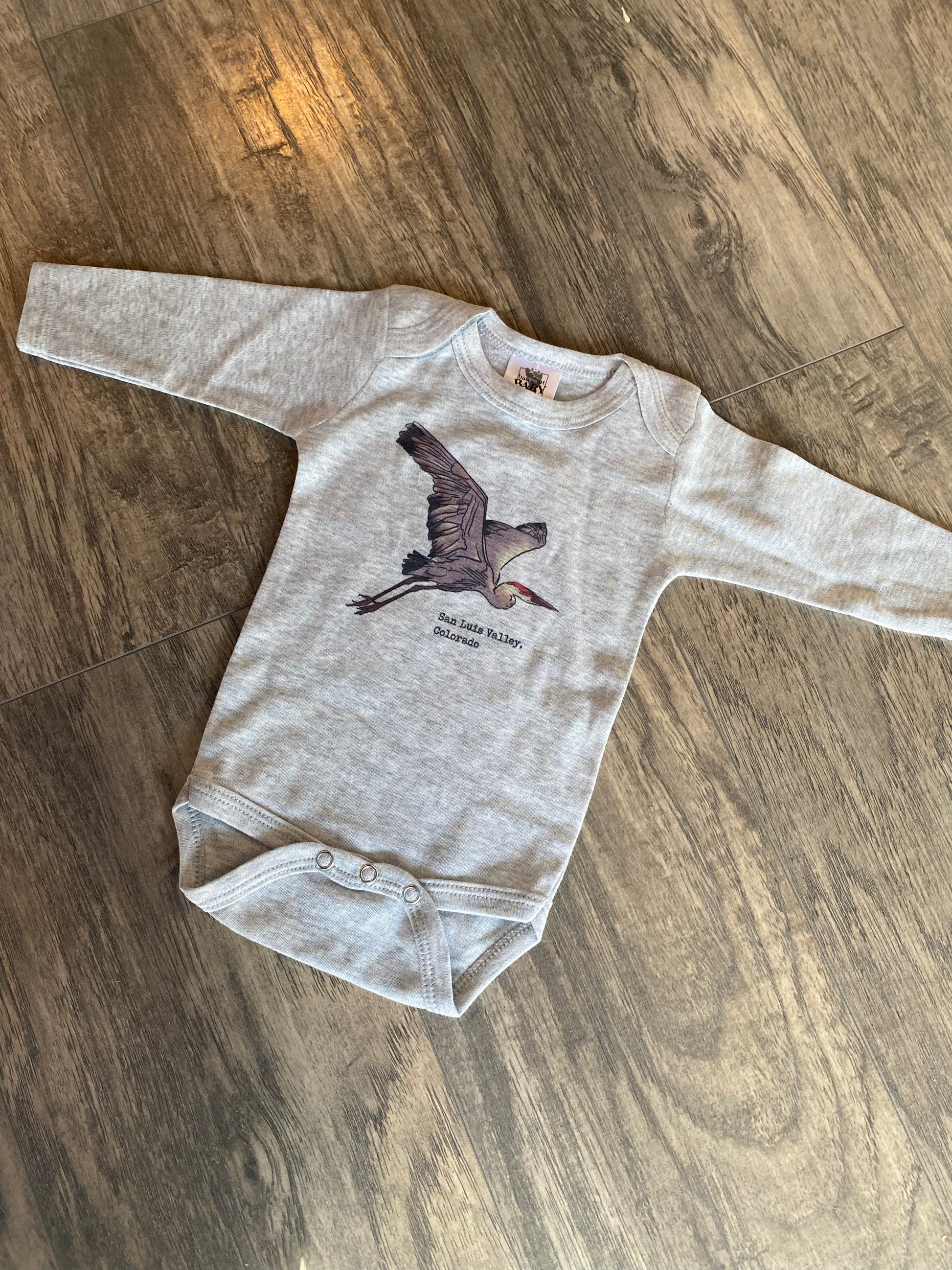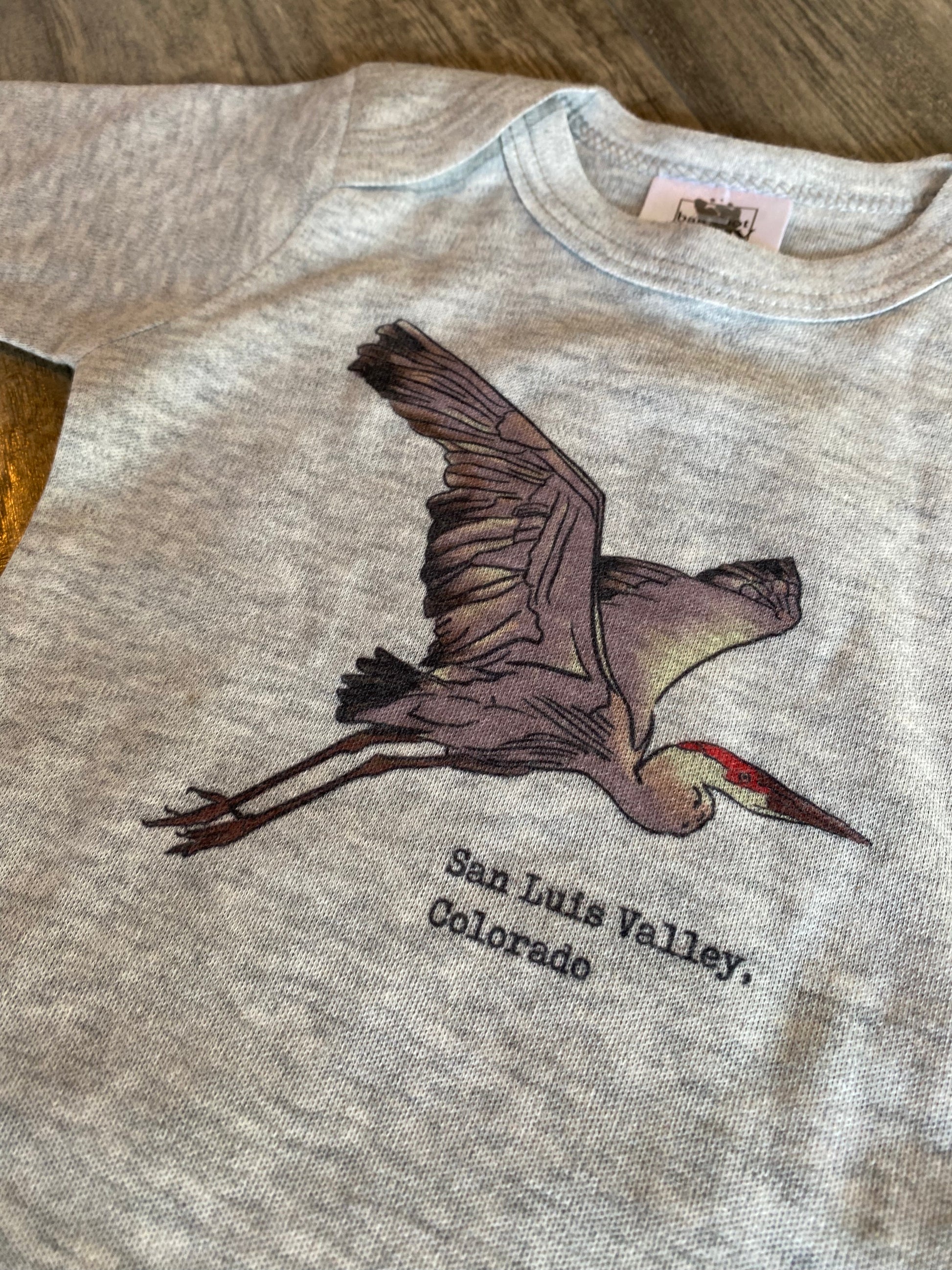 Introducing the Sandhill Crane Colorado Shirt - perfect for The Crane Festival or everyday wear. Available in long or short sleeves, for babies to big kids. Made with a super soft cotton blend, it's as comfortable as it is stylish. Show your love for Colorado and its local Sandhill Cranes!